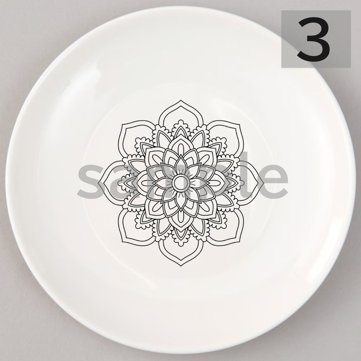 アウトライン入り食器は、専用の転写シートで曼荼羅柄を貼付け後、オーブンで焼成しライン定着させたものを発送いたします。